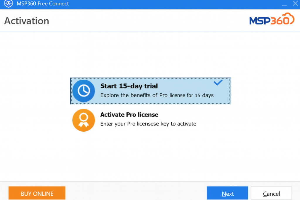 Start a free, 15-day Connect Pro trial right in the MSP360 Connect app installed on your computer.